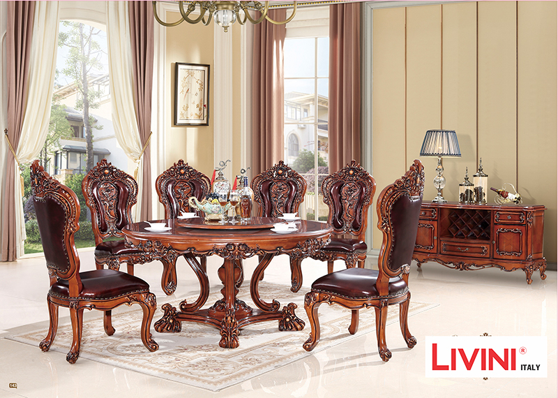 Bộ bàn ăn cao cấp với khung bàn và ghế được sản xuất bằng chất liệu gỗ tự nhiên có độ bền sử dụng cao, sản phẩm được chạm khắc hoa văn cổ điển Pháp và phủ sơn PU cao cấp, bọc da bò nhập khẩu Italty tạo cảm giác sang trọng lịch lãm cho ngôi nhà Việt.